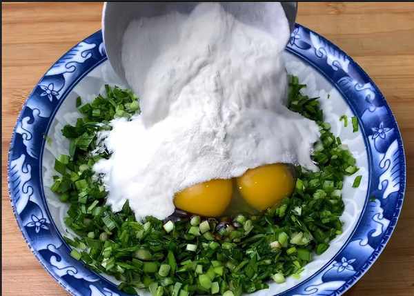第一步:韭菜清洗干净,然后切碎,放入鸡蛋、玉米淀粉、面粉、盐、泡打粉和白胡椒粉,用筷子搅拌均匀。