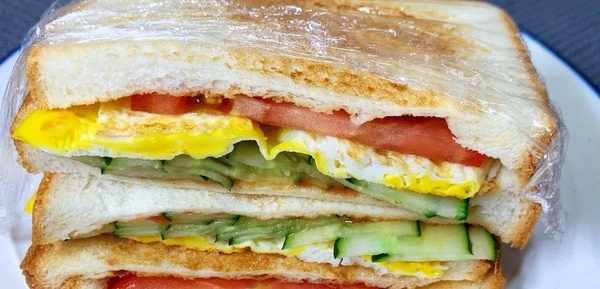 2、铺上保鲜膜,放一片吐司,放沙拉酱或者番茄酱,放入鸡蛋,黄瓜片,在盖上一片吐司,放入三明治肠,番茄片,再盖上一片吐司。