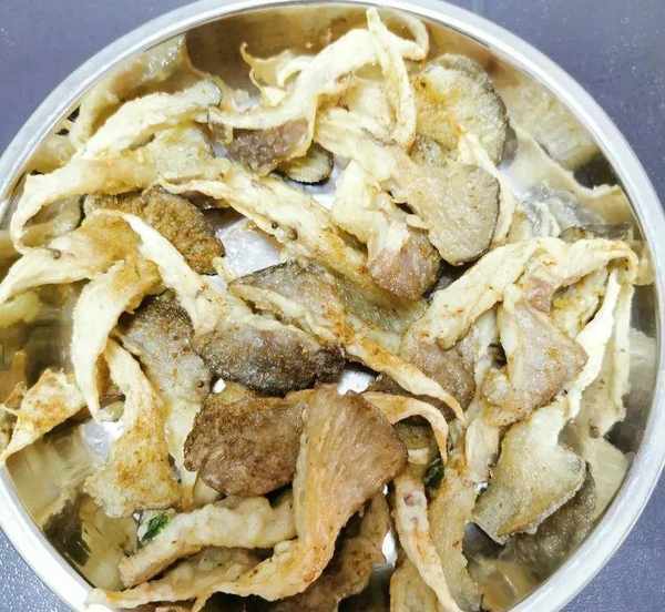 3、将蘑菇倒入面糊中搅拌均匀,让蘑菇充分地沾满面糊。