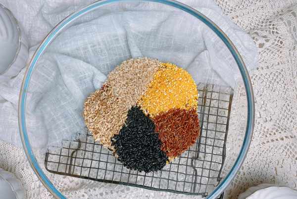 1、先把煮5色糙米的原材料都准备好,粗粮的比例是1:1,这样煮出来的杂粮饭营养更均衡,根据自己家人的数量来决定份量;