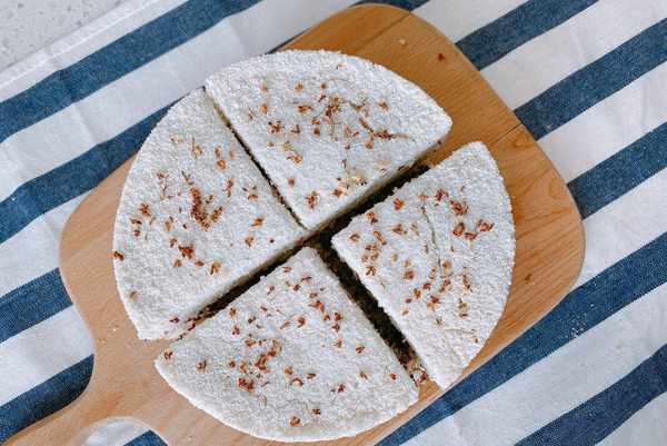 6、出锅之后脱模,撒上少许干桂花,松软香甜的茯苓桂花糕就做好了,香甜松软还带有点嚼劲;