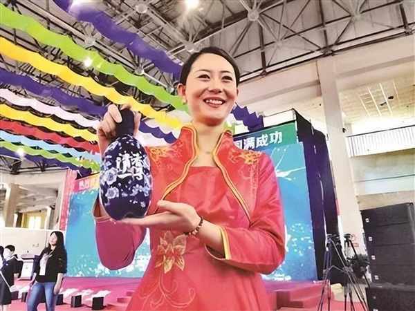 “杏花村汾酒”专业镇的生产厂家注重酒品牌宣传,取得了良好效果。图为某厂家推销员正在进行产品展示。山西经济日报记者 李全明 摄