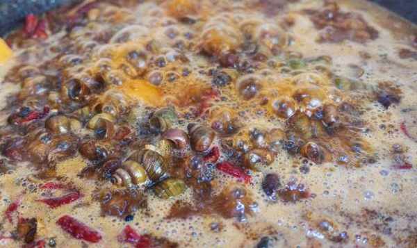 2、锅烧热,倒入适量的油,油热后加入药明和辣椒炒香,倒入适量的酱油,然后倒入田螺翻炒均匀,搅拌均匀后,倒入一瓶啤酒没过蜗牛,烧开。开盖后转小火煮10分钟。等汤收的差不多了,加入适量的盐搅拌均匀,然后关火。关火后可以将田螺在汤里泡一会,会更入味。