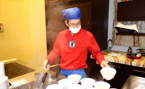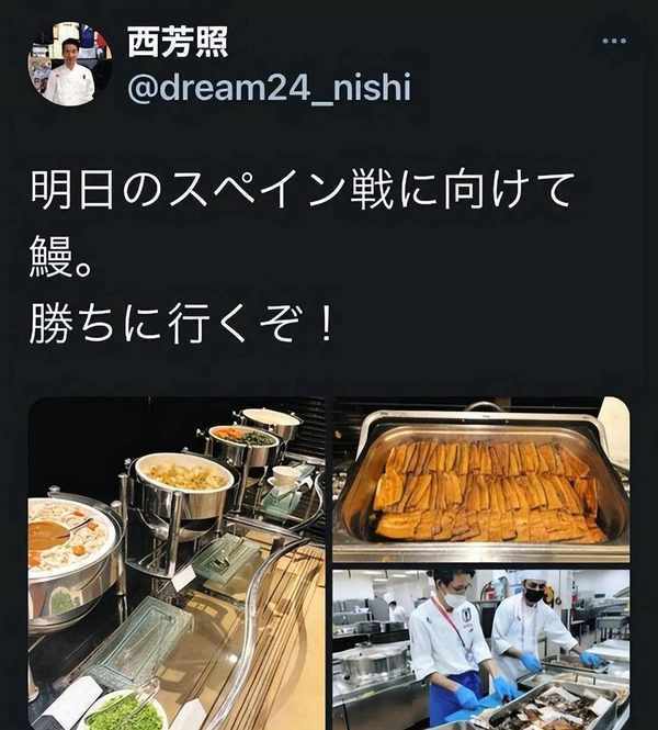 本国足大厨西芳照,关于餐饮他介绍:当天早餐的主菜是盐烧青花鱼,午餐是牛排,晚餐最丰盛,有两道肉菜,两道鱼,还有3种青菜,一共7道菜,另有意大利面、荞麦面、米饭等主食。