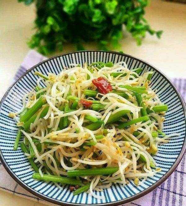 材料:绿豆芽500克,芹菜2支,熟肚1小块,花生油30克,葱1份,姜1小块,干辣椒2条,白蜡2克,2醋2勺,酱油2勺,盐少许半勺