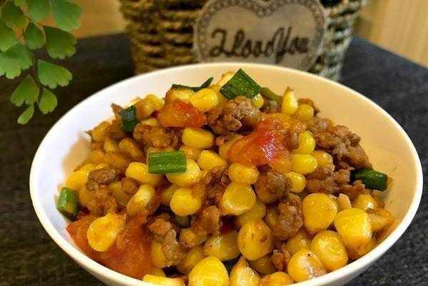 2、玉米切块,番茄切块,肉剁碎;热锅冷油,将肉末炒至变色;取出肉,然后烤玉米粒,烤香,稍微变色即可;