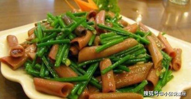 5、放入海肠,加入蚝油和料酒翻炒片刻,再加入韭菜和盐,大火翻炒1分钟。