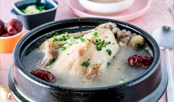 过滤糯米用米饭、1个人参、2个大枣和8个蒜瓣填塞鸡肉。 在一个深锅里,把水烧开当水沸腾时,将鸡肉放入水中。盖上盖子,用中高温煮30分钟。把火调到中低,再煮40分钟,直到鸡肉、人参和米饭变软。如果需要,加一点热水。