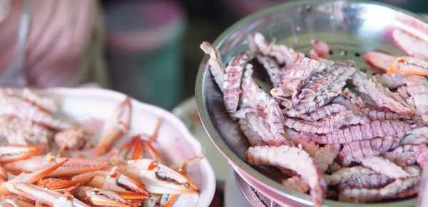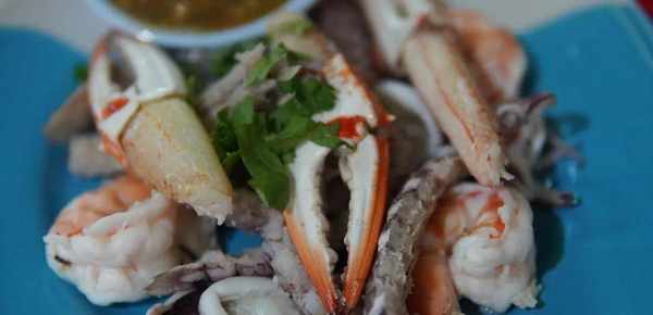 一盘里有大虾、蟹脚、鱿鱼、皮皮虾,一大盘子。