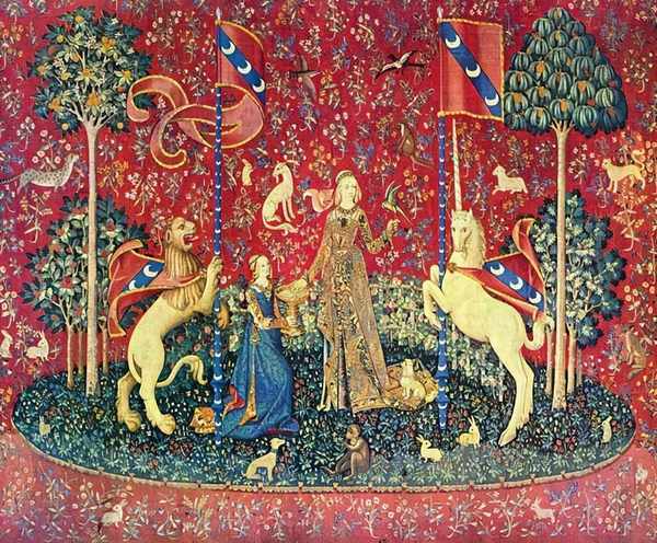 在专门描述味觉的那块挂毯中,独角兽与狮子所举的三角旗和所披的盔甲上,都带有让·勒维特的家族纹章。