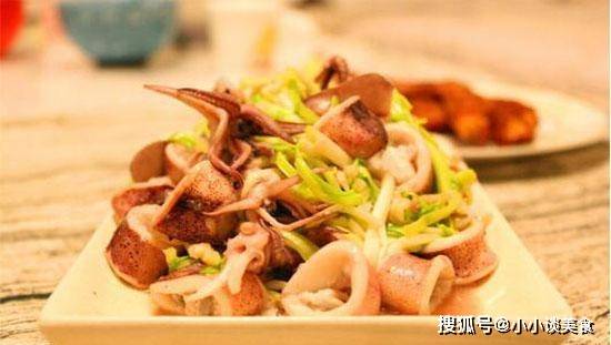 1.鱿鱼用清水洗净,去掉背面透明软塑料薄膜状的“骨头”,用开水蒸熟,捞出沥干水分,每条鱿鱼切成3-4片