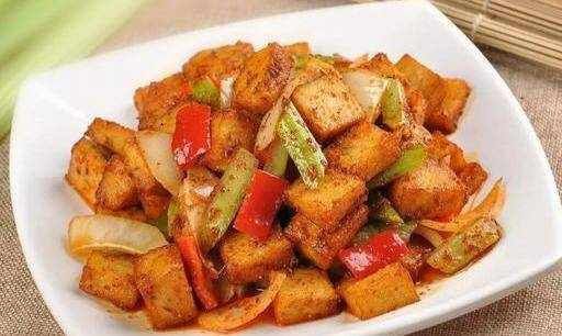 做法:1、豆腐切块;葱切段,姜切丝;干辣椒切成片,青红椒切成小块;洋葱去皮洗净,切成小块;