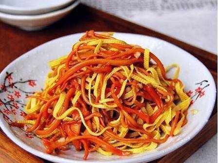 2、加入虫草花和豆腐皮;加盐、味精、香油、辣椒油调味;拌匀。