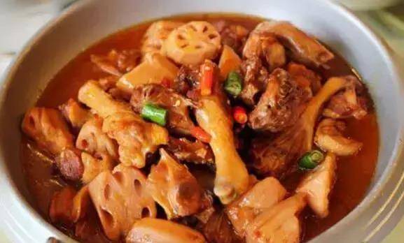 材料:鸭200克、藕2节、植物油10克、食盐4克、姜5片、八角2个、花椒6粒、桂皮2段、干辣椒3个、料酒3克、豆瓣酱1勺、黄酱1勺、啤酒半罐、胡椒1茶匙