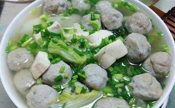 2、鸡毛洗净,用水浸泡。将豆腐切成小方块。将鱼丸切成两半。