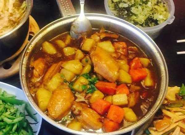 2、约2、3秒后倒入土豆和萝卜,拌匀,翻滚至入水(水几乎没过土豆和萝卜即可),加盐,加老抽,酱油倒掉水滚后的酱汁、糖,拉两下就可以盖上盖子了。3.注意时不时的下锅,等土豆和胡萝卜变软,不喜欢面的就不要煮了,根据自己的口味调味就好,酱油会有点辣。