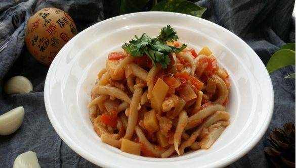 3、稍微煎一下,然后把切好的章鱼倒入油锅里一起炒。(章鱼也可以焯水,不过我喜欢直接煎章鱼)4.加盐和少许生抽炒至软烂即可上桌
