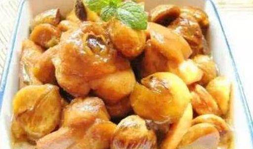 3.锅中油烧热至70%,将鸡块炸至金黄,捞出沥油。将栗子放入锅中烤熟,捞出沥油待用
