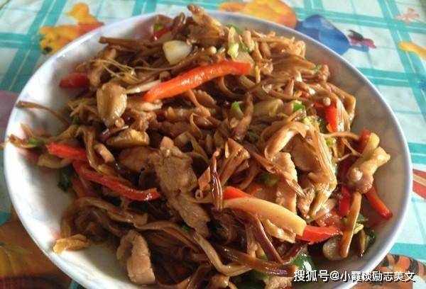 配料:干黄花菜200克,瘦猪肉50克,葱、姜、辣椒、花椒粉1/2茶匙、盐1茶匙、生抽2汤匙、老抽1/2匙、1小碗肉汤;