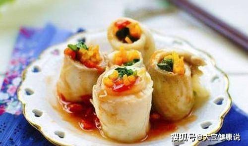 3、将切好的蔬菜放在白菜叶上,卷成卷,切块;