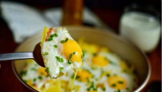 4.将培根切碎,与土豆混合。把它放在烤盘里,戳几个小孔准备放鸡蛋。撒上一些黑胡椒和盐。将土豆培根放入烤箱以180度烘烤15分钟。