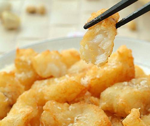4、锅烧热,倒入油,放入鳕鱼片炸成金黄色;
