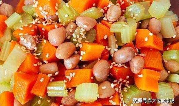 将花生、芹菜和胡萝卜放入碗中,加入一勺香油、一勺生抽、一勺陈醋、适量的盐和糖拌匀。