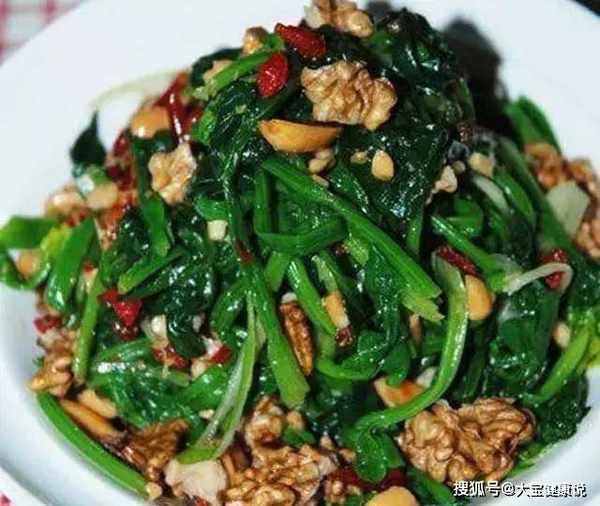 原料:菠菜300克,核桃仁50克,麻辣花生碎50克,枸杞子5克,香油适量,盐适量,生抽适量。