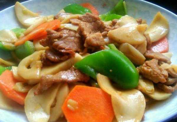 所需材料:杏鲍菇、猪肉、葱、姜、酱油、蚝油、盐、水、淀粉、食用油