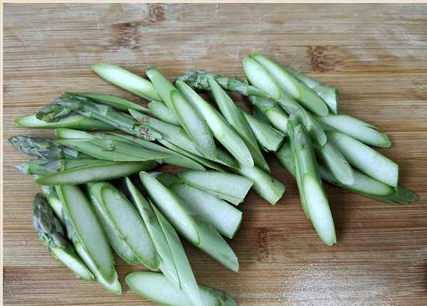【第一步】:新鲜的芦笋买回来之后,先用盐水浸泡10分钟,然后切掉根部比较老的部位,再切成斜的马耳片备用,