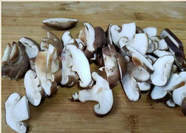 香菇提前用水洗一下,然后放入大碗中,加入1勺食盐,1勺小苏打浸泡20分钟泡软泡发,用这个方法泡出来的香菇能够泡得又快又好了,然后切成薄片即可。