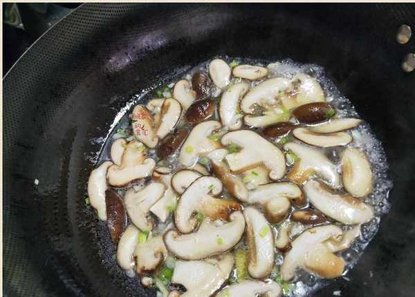 【第二步】:炒锅烧水,水开之后把香菇倒入锅中焯水,给香菇焯水主要是为了去除它里面的菌种的味道,还有二个好处,一是能够让接下来的炒菜的环节变得更加的快速。二还能让香菇的味道更加的柔软滑嫩。