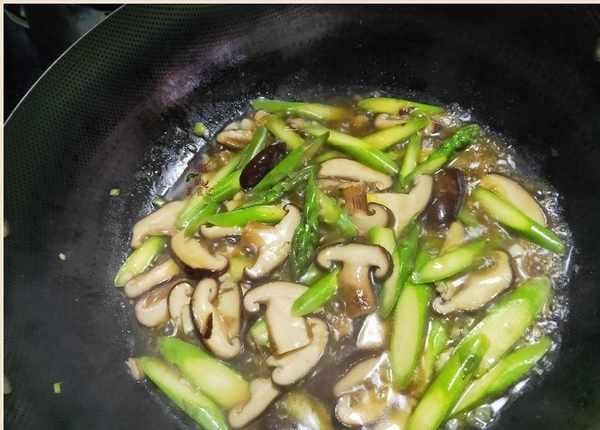 【第三步】:接下来炒锅洗净放少许食用油,然后把焯水过后的香菇倒入锅中加入葱蒜末翻炒2分钟,然后再把芦笋倒入锅中炒至芦笋断生,