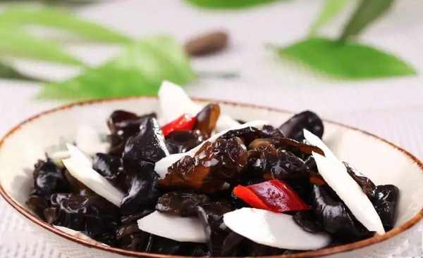 3.准备好的木耳提前用水泡好,泡开即可,泡的时间不宜太长,大概半个小时应该差不多了。在锅里倒入适量的清水,加入少许的食盐,等水煮开后将已经泡好的木耳倒入,焯水三分钟即可捞出备用。