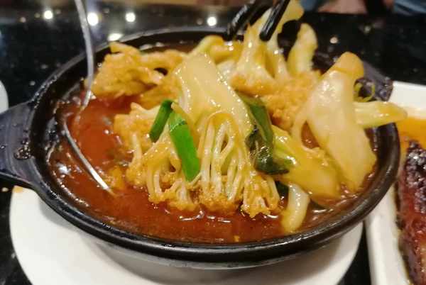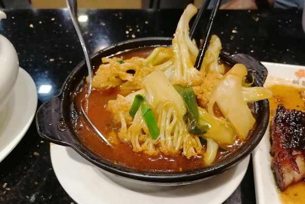 酸甜番茄花菜煲:它主要是由番茄、花菜,再加一些番茄酱,下少许的大葱叶,一起来煲成的。