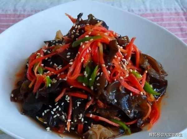 2、焯水后的木耳和胡萝卜丝,青椒丝加入盐、醋、白糖、味精、蒜泥、香油、花椒油、红油辣椒拌匀即可!