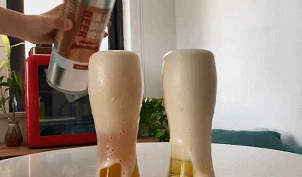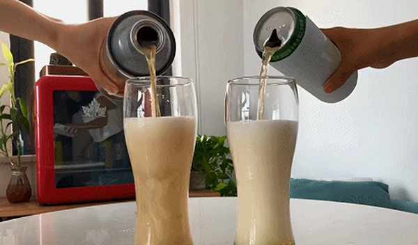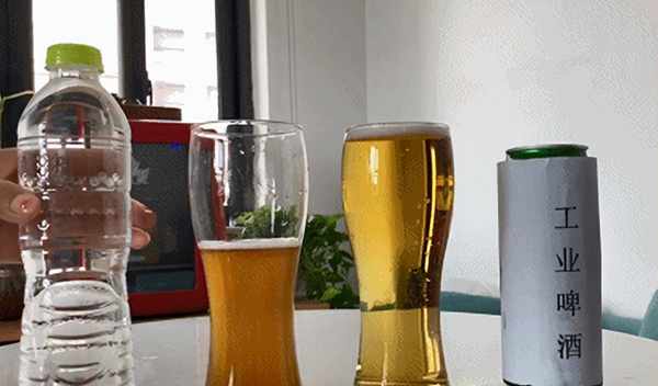 把两个杯子都加满,待啤酒泡沫过顶,溢出,静止后,会发现工业啤酒的瓶子基本是满的,而精酿啤酒的瓶子剩余2/3左右,“水分比较大”。