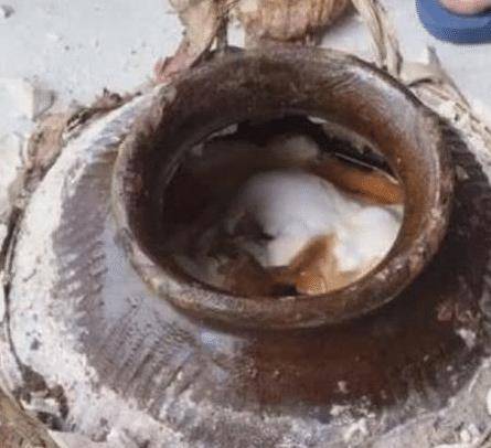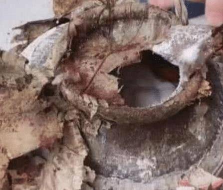 然后准备一个锤子敲开一个小口,把盘子周围的泥土给敲掉了,等到露出一个口的时候,大家都闻到了酒香味儿,这就是正宗的女儿红。等等把盖子完全打开了以后,才能看到里面的情况,看来当初制作这坛酒费了很多功夫,密封相当严实很多人呢忍不住想要尝尝这坛封了20多年的酒。