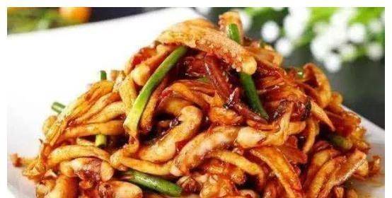 做法:1、将晒干的鱿鱼用冷水过夜洗净,去紫膜切条;五花肉洗净切块,蒜苗切段;
