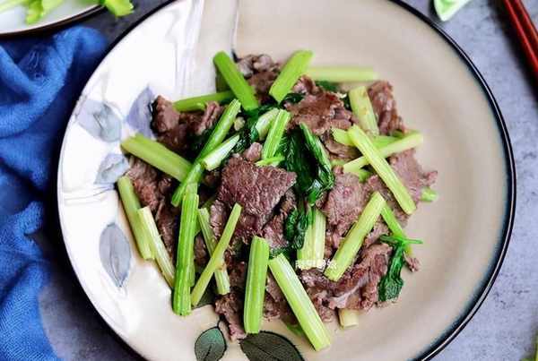 1.牛肉洗净顺纹切,芹菜洗净切块。