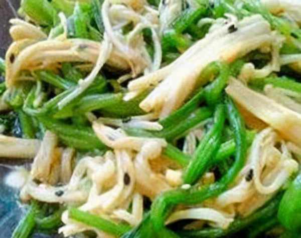 2、将金针菇和菠菜盛盘,蘸香油、生抽拌匀即可食用。