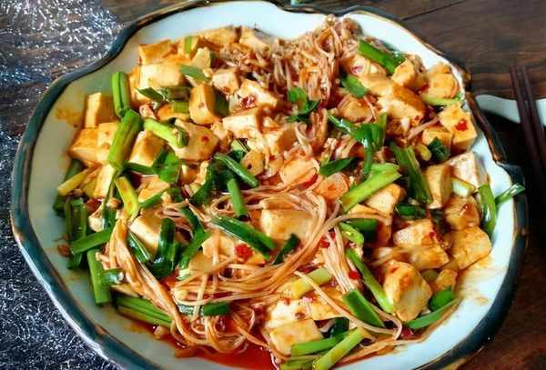 材料:北豆腐1块,金针菇200克,韭菜1把,油盐适量,郫县豆瓣酱1汤匙,葱1瓣,姜1片,蒜2瓣,1瓣酱油一大匙,鸡精一茶匙,淀粉适量
