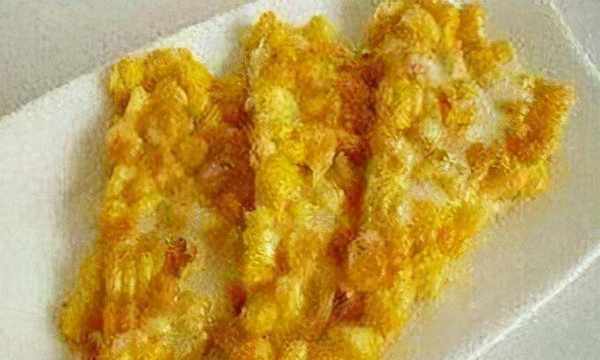 将玉米粒压出,用锅铲掰碎,再加入食用油,中火煎,待一面成型后轻轻翻动。