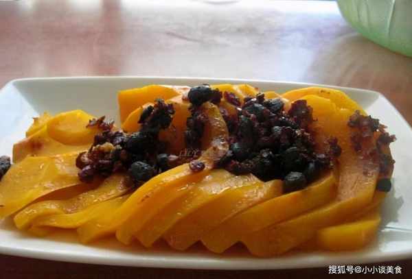 3.将自制的豆豉淋在金瓜上,蒸约20分钟,拌匀即可食用。