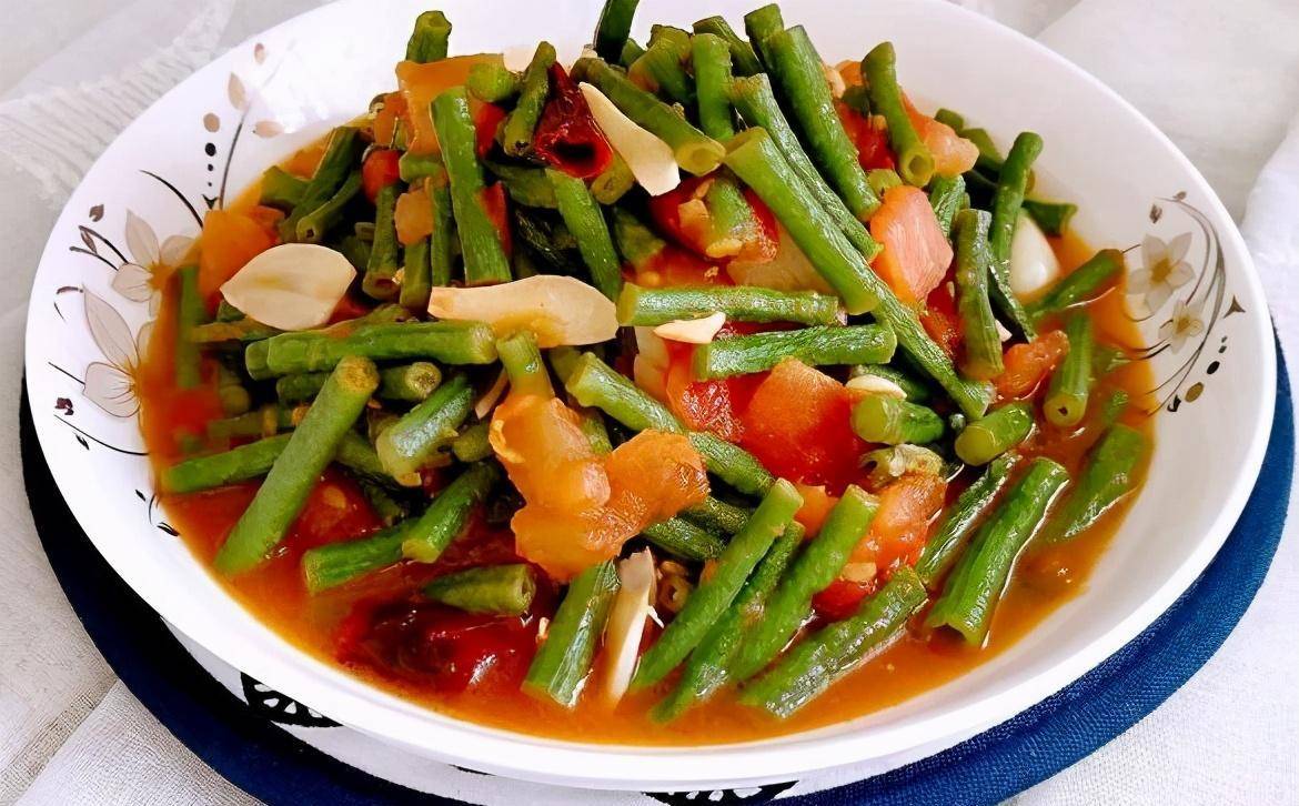原料:豆角、西红柿、大蒜、番茄酱、青椒、酱油、盐、胡椒粉、白醋。
