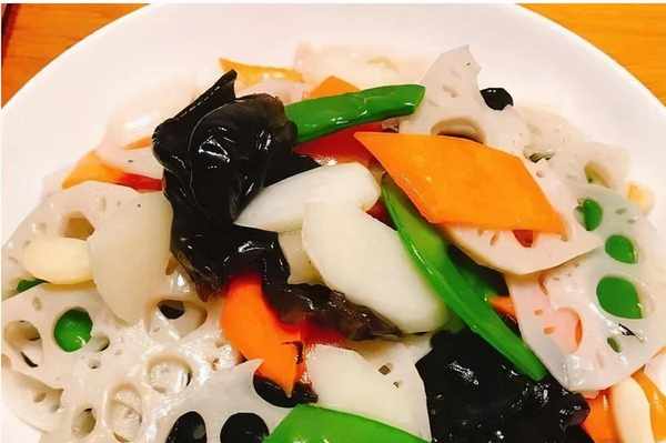 1、莲藕去蒂,洗净切片,浸冷水,胡萝卜去皮,洗净切片,香菇去蒂,豌豆去筋,洗净备用。