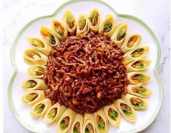 3.将粉丝、胡萝卜丝和菠菜放入蛋卷的一端,轻轻滚动,然后用锯齿刀切开,装盘。中间加入切碎的备用鸡蛋和胡萝卜花。