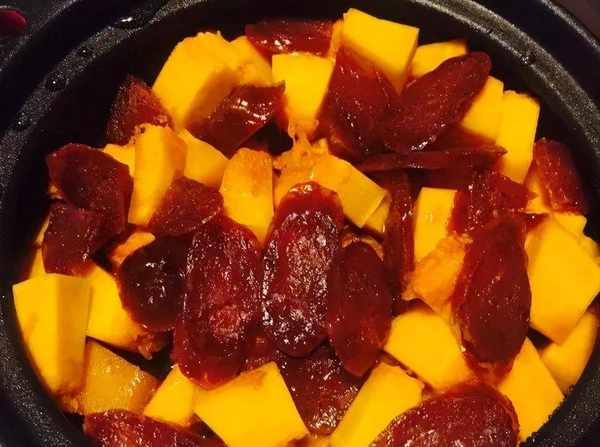 材料:香肠、南瓜、剁椒、生抽、蚝油、糖、香油、香醋、蒜头