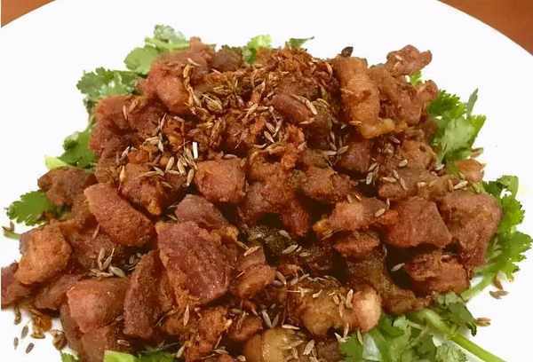 2.上菜:将肉揉搓少许盐浸泡一夜,第二天早上用开水煮5分钟,洗净;