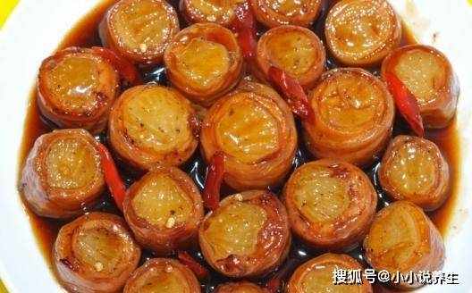 3、将卷好的萝卜塞进大肠,再切成等长的段;